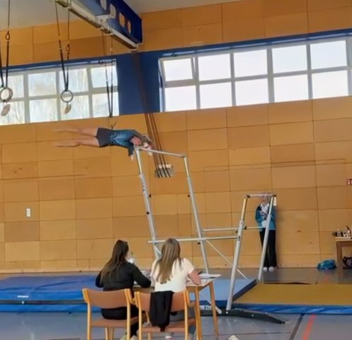 Zuschauer:innen veranschaulichte die Anforderungen im Leistungsturnen. Am Ende wurde