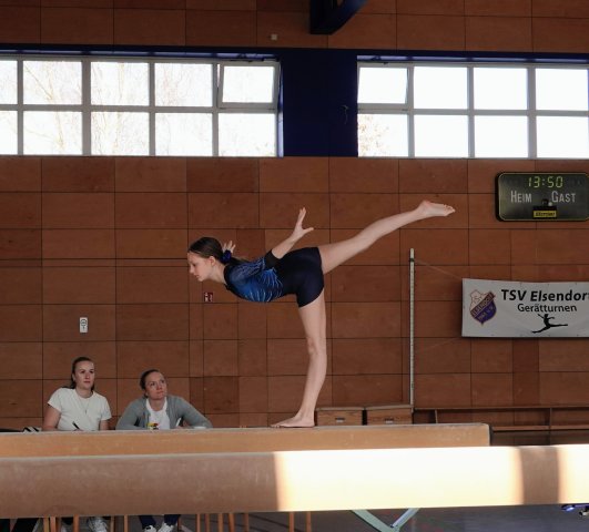 Die neu gegründete Gerätturnabteilung hat mittlerweile 40 gelistete Turnerinnen. 30 Mädchen im Alter von 7 – 16 Jahren traten am 07. März 2026 in der Schulturnhalle der Gemeinde Elsendorf zur internen Vereinsmeisterschaft im Gerätturnen an. Eine ansehnliche Anzahl von turninteressierten Zuschauern verfolgten über den Tag verteilt die Wettkämpfe. 9 Mädchen konnten ihre Teilnahme aufgrund Erkrankungen leider nicht wahrnehmen. Am Vormittag fieberten 17 Breitensportmädchen ihrem Start in der Wettkampfklasse Turn 10 entgegen. Aus Schwebebalken, Boden, Sprung, Reck und Minitrampolin mussten 4 Geräte ausgewählt werden. Die Riegen waren nach Leistungsstand und Alter zusammen gestellt. Die Turnerinnen traten nach Einmarsch, Begrüßung, erwärmen und einturnen in den Wettstreit. Geprüfte Kampfrichterinnen aus den eigenen Vereinsreihen: Bianca Baumann, Hannah Schillinger an Boden/Reck, Eva Herberth, Susi Faltermeier am Schwebebalken/Sprung/Minitramp, bewerteten unabhängig und gerecht. Ergebnisse: Gruppe 4: 1. Laura Kollmannsperger/67 P/2016, 2. Rosi Schranner/57,75 P/2018, 3. Katja Buchner/47,75 P/2017. Gruppe 3: 1. Marie Altweck 52,75 P/2016, 2. Ebrar Erdogan 47,75 P/2018, 3. Stina Hackl /39 P/2016. Gruppe 2: 1. Veronika Frank/64,5 P/2013, 2. Marie Gallmeier/64,25 P/2013, 3. Johanna Schweiger/60,25 P/3013, 4. Linda Lamert/58 P/2013, 5. Julia Ippy/57,75 P/2013, 6. Cloie Alguero 52,5 P/2015. Gruppe 1: 1. Theresa Müller 67,5 65,3P/2011, 2. Franziska Brunner 66,5 P/2012, 3. Laura Esterer 64 P/2012, 4. Loresa Neziri 60,75 P/2012, 5. Theresa Meier 60,5 P/2012. Über den Pokal für den Gesamtsieg aller Teilnehmerinnen vom VormittagsTurn10 Wettkampf aus den Händen und gespendet vom TSV Vorsitzenden Frank Gerhards freute sich zurecht Theresa Müller.